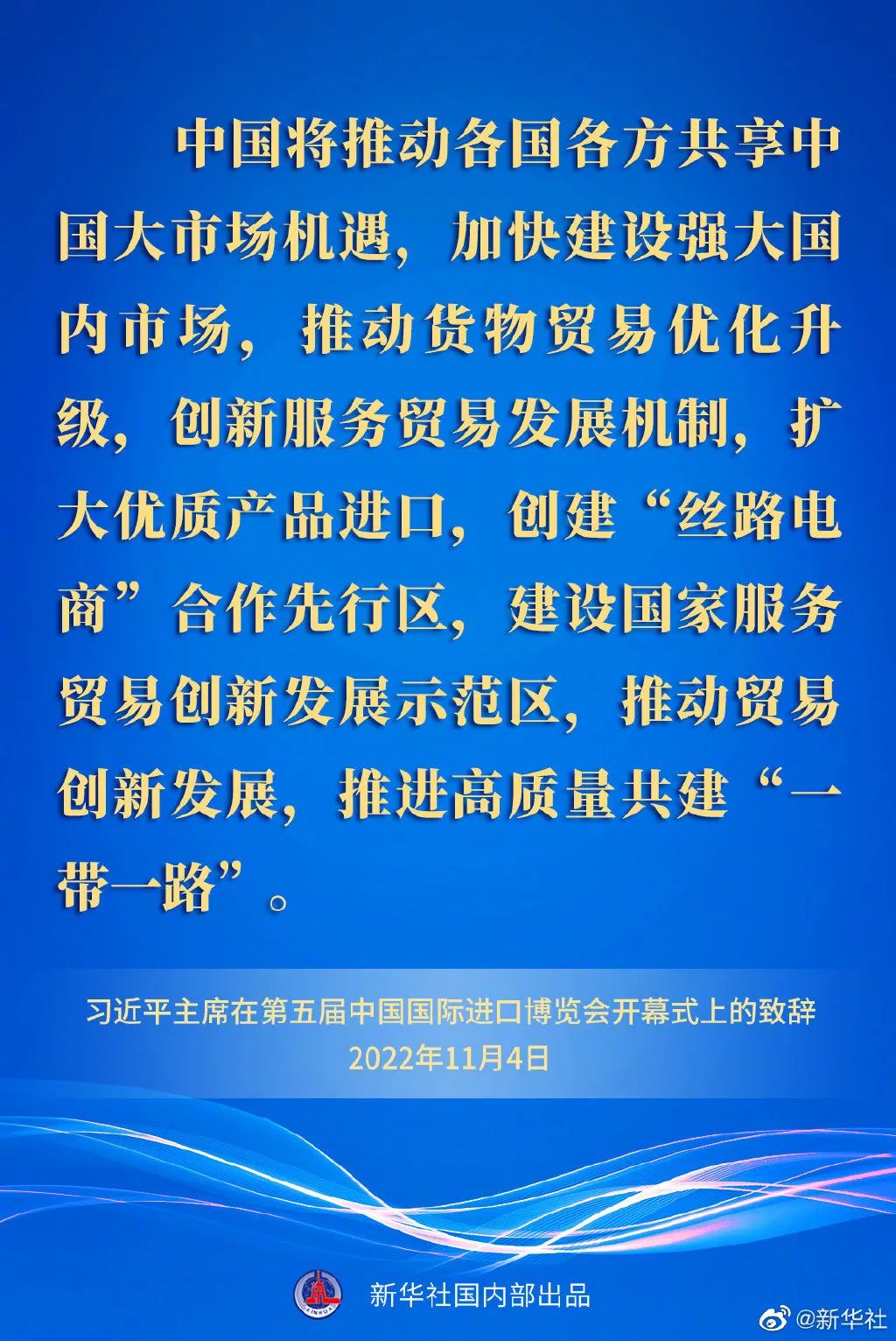 ——中國將推動各國各方共享中國大市場機遇,加快建設(shè)強大國內(nèi)市場,推動貨物貿(mào)易優(yōu)化升級,創(chuàng)新服務貿(mào)易發(fā)展機制,擴大優(yōu)質(zhì)產(chǎn)品進口,創(chuàng)建“絲路電商”合作先行區(qū),建設(shè)國家服務貿(mào)易創(chuàng)新發(fā)展示范區(qū),推動貿(mào)易創(chuàng)新發(fā)展,推進高質(zhì)量共建“一帶一路”。