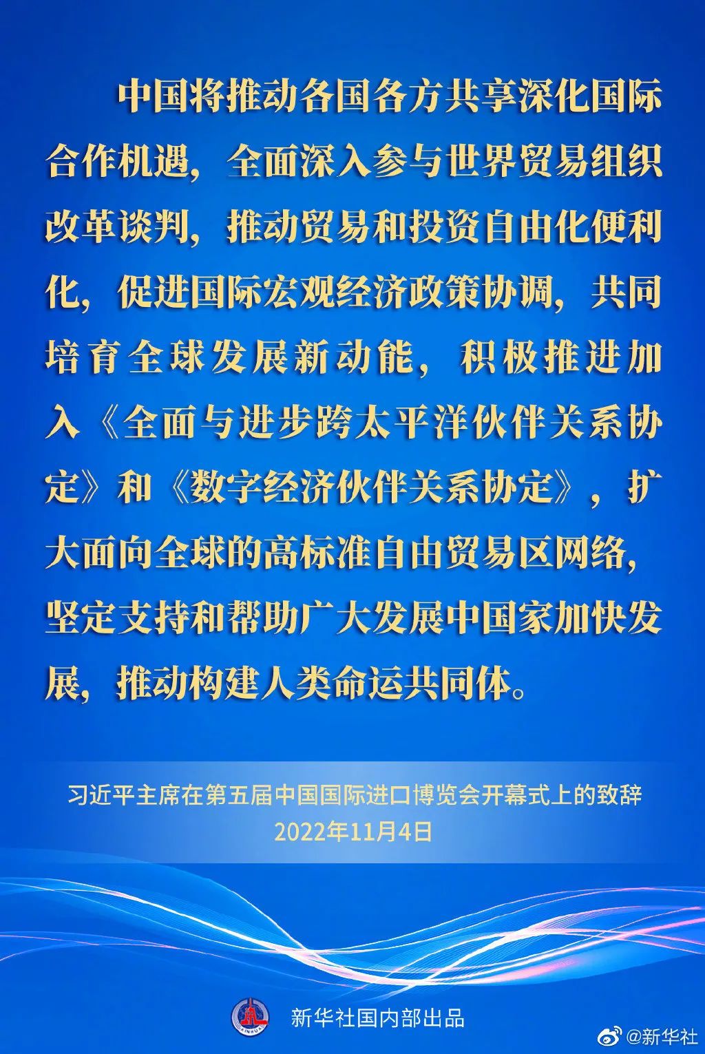 ——中國將推動各國各方共享深化國際合作機遇,全面深入?yún)⑴c世界貿(mào)易組織改革談判,推動貿(mào)易和投資自由化便利化,促進國際宏觀經(jīng)濟政策協(xié)調(diào),共同培育全球發(fā)展新動能,積極推進加入《全面與進步跨太平洋伙伴關(guān)系協(xié)定》和《數(shù)字經(jīng)濟伙伴關(guān)系協(xié)定》,擴大面向全球的高標準自由貿(mào)易區(qū)網(wǎng)絡,堅定支持和幫助廣大發(fā)展中國家加快發(fā)展,推動構(gòu)建人類命運共同體。