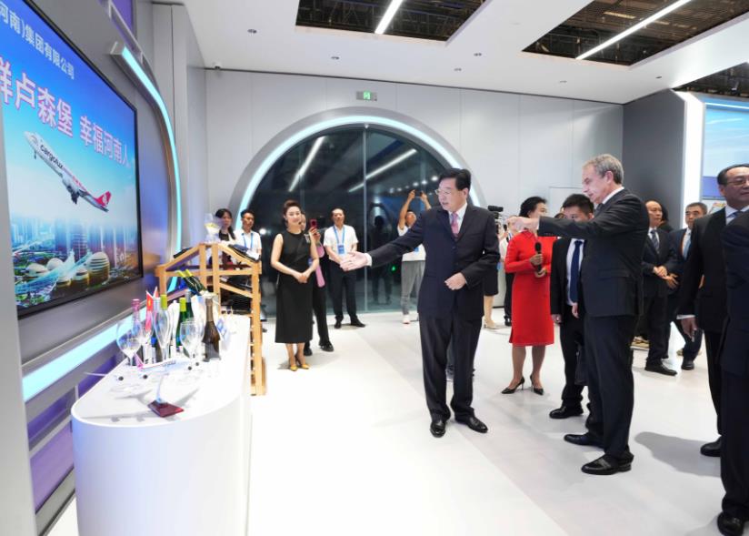論壇開始前,與會嘉賓參觀了主題展臺。在中豫航空集團(tuán)展臺前,嘉賓們被來自盧森堡的“申根精神”葡萄酒、法國知名品牌水晶杯、德國繪有“絲綢之路”元素的骨瓷等產(chǎn)品吸引;詳細(xì)了解了鄭盧“空中絲路”在中歐互聯(lián)互通、經(jīng)貿(mào)往來中發(fā)揮的橋梁作用。