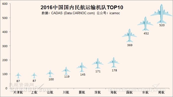 在航空公司中,東航引進的飛機最多,為52架,國航36架、南航32架。