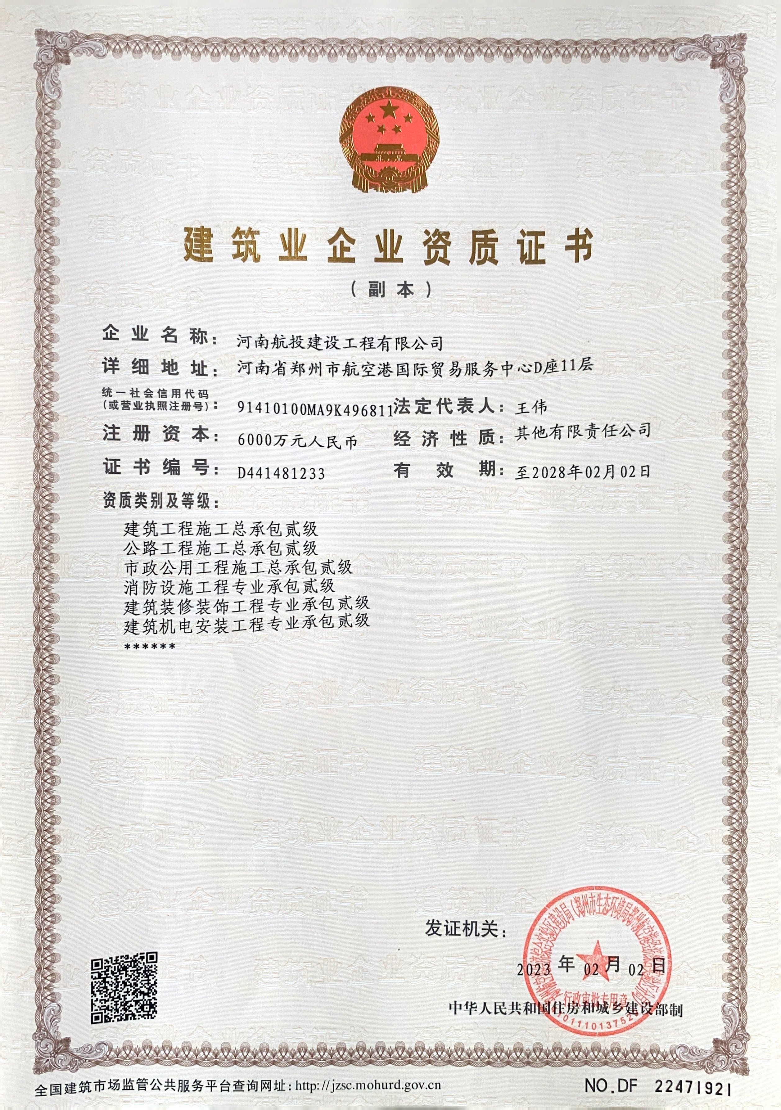 航投建工由河南航投集團旗下河南航投航空基礎(chǔ)產(chǎn)業(yè)發(fā)展有限公司與貴州省場道工程有限公司共同出資成立。2022年9月28日,航投建工成功取得機場場道工程專業(yè)承包二級資質(zhì);同年12月8日通過河南省住建廳各項審核,取得《建筑施工企業(yè)安全生產(chǎn)許可證》,完成參與市場競爭的全部前置條件;12月23日,被評為鄭州航空港經(jīng)濟綜合實驗區(qū)建筑業(yè)重點培育企業(yè),為施工總承包及多項專業(yè)資質(zhì)的取得打下堅實基礎(chǔ)。