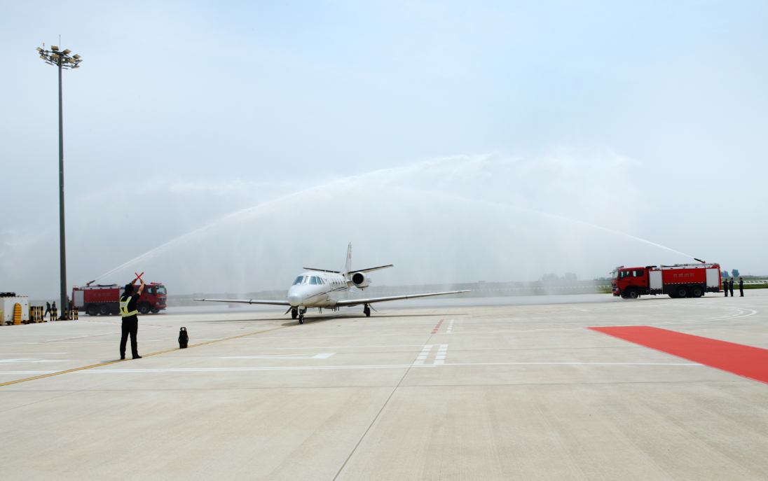 5月17日上午,隨著塔臺發(fā)出明確指令,一架“獎狀C560”平穩(wěn)降落在安陽紅旗渠機場,并接受“水門禮”。這是中國民用航空飛行校驗中心的校驗專用飛機,它的到來意味著安陽紅旗渠機場“第一飛”順利完成,校飛工作正式開始,標(biāo)志著安陽紅旗渠機場從地面建設(shè)向開放運行的邁進。