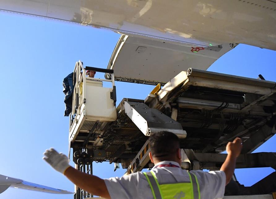 The staff of Zhengzhou station of Cargolux Airlines International were unloading cargo at Zhengzhou Xinzheng International Airport in central China's Henan Province on Aug. 1, 2023. (Xinhua/Li Jianan)