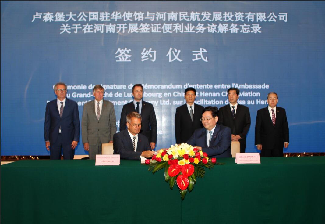 6月13日,省委書記、省人大常委會主任謝伏瞻在鄭州會見了來豫訪問的盧森堡首相格扎維埃?貝泰爾一行,并和省長陳潤兒共同見證有關合作協議的簽署。河南航投黨委書記、董事長張明超一同參加會見,并代表河南航投與盧森堡駐華大使石泰嵋簽署《關于在河南開展簽證便利業(yè)務諒解備忘錄》.