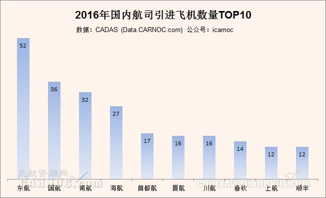 在航空公司中,東航引進的飛機最多,為52架,國航36架、南航32架。